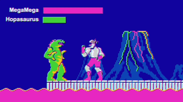 Jude drew inspiration from Kaiju monster movies, professional wrestling, and 8-bit video games. The resulting “Very Mega” character is what would happen if Ultraman raided “Macho Man” Randy Savage’s wardrobe and slept in a volcano that spews rainbows.